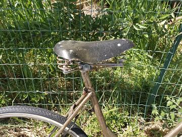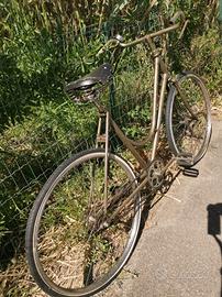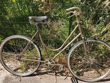 Vendo bellissima bicicletta d'epoca da donna, un vero pezzo di storia del ciclismo urbano. La bici presenta un fascino senza tempo grazie al suo telaio con doppia canna sinuosa (modello "parigina" o "diagonale") e componenti originali dell'epoca. La bici è una base perfetta per un progetto di restauro conservativo o per essere trasformata in una splendida city bike in stile retrò. Caratteristiche principali: Telaio: Struttura solida con linee classiche, vernice originale con splendida patina del tempo. Sella: Modello d'epoca in cuoio con triple molle (molto ricercata). Manubrio: Classico manubrio "R" con leve dei freni integrate e campanello vintage incluso. Ruote: Cerchi e mozzi d'epoca, copertoni sostituiti di recente (pronta per rotolare). Meccanica: Trasmissione a scatto fisso/singola velocità con corona lavorata. Stato attuale: La bicicletta è funzionante ma necessita di una revisione generale (lubrificazione, controllo freni) e di una pulizia approfondita per far tornare a splendere le cromature e il telaio. Mancano le manopole e i parafanghi, il che la rende perfetta per chi vuole personalizzarla a proprio gusto. Ideale per chi ama lo stile vintage, per vetrine di negozi o per partecipare a eventi cicloturistici d'epoca (tipo L'Eroica).
