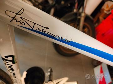 Vendo per inutilizzo e liberare spazio. Bici da corsa Tommasini (firmata Irio Tommasini, scomparso nel 2024) in titanio 57x57. Sempre tenuta bene. Forcella Columbus Muscle, cambio Campagnolo record carbon titanium 2x10, leve record carbon, pedivelle ultra torque carbon, freni Record, reggisella Campagnolo carbonio. Pattini Dt swiss. Sganci rapidi titanio. Equipaggiata con ruote neutron ultra (mozzo in carbonio) praticamente nuove, copertoncini Continental GP praticamente nuovi anch'essi. Sella Prologo Scratch M5. Manubrio Surly Truck Stop. Lascio anche manubrio Ritchey originale. Insieme aggiungo le seguenti ruote (tutte in buone condizioni) alcune con già montati i copertoncini Continental GP praticamente nuovi, alcune con cassetta e sacca: - Campagnolo Zonda 2way fit - Neutron (normali, non ultra) - Mavic open pro sup con mozzi Record - DT Swiss R1.1 Più ruote singole American Classic 350, Mavic Ksyrium, DT swiss Tricon e Ursus ts37 per tubolare. Dato che mi serve spazio vendo solo in blocco o solo le ruote (sempre in blocco), non rispondo a richieste diverse.