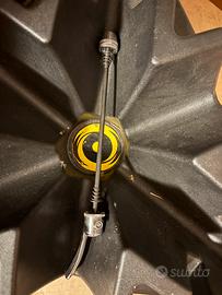 Trainer per allenamento indoor Cycleops Fluid. Trainer per sgancio rapido (solo per sgancio rapido, non perni passanti, quindi per bici con freni tradizionali con attacco ruote con sgancio rapido). Compresi due stabilizzatori ruota anteriore, sovrapponibili per alzare la bici e simulare pendenza della strada. Non é uno smart trainer, funziona con ruota installata e con atrito gomma su rullo. Fubzionamento moldo fluido per simulare andamento su strada. Ottimo per allenamenti indoor semplici durante l’inverno.