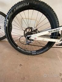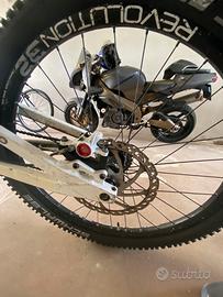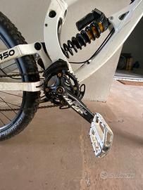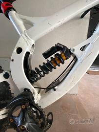 la bici ha come componentistiche forcella marzocchi bomber 888, ammortizzatore posteriore cane creek, freni formula xr per la ruota posteriore e formula r1 per l’anteriore e monta uno shimano xtr