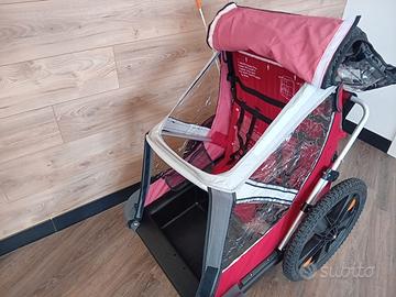 Carrello portabimbi per bicicletta adatto per il trasporto di uno o due bambini, si aggancia alla bici con il suo apposito attacco, certificato EN 15918 per la qualità del trasporto dei bambini, dotato di ampio vano di accesso frontale e superiore, cinture di sicurezza a cinque punti per due bambini, ruota da 20", tasca porta oggetti, freno di stazionamento a pedale, tendina multistrato, impermeabile
