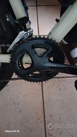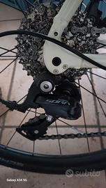 guarnitura completa Shimano Sora, telaio in alluminio e forcella in carbonio, copertoni Schwalbe G One Allround da 37, camera d'aria senza forature , doppio portaborraccia, portatelefono in lega su cannotto sterzo.