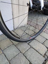 Bici da corsa con telaio in carbonio e cerchi in alluminio bontrager race.