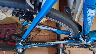 bicicletta taglia 58 usata esclusivamente sui rulli, comprata con telaio scollato sul fodero posteriore destro, fatto riparare come si vede in foto. Montata con gruppo Sram Force 22, guarnitura fsa 172.5 53/39, cassetta shimano ultegra 11 30, catena shimano 105, freni sram rival, manubrio zipp, ruote hed ardenne +, compreso rulli interattivo. regalo inoltre supporto garmin e garmin edge 520, con batteria che dura qualche uscita e piccolo difetto sul monitor. Non vendo nulla separatamente.