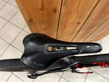 Montaggio totalmente custom con freni SHIMANO XT a 2 pistoni, forcella ROCK SHOX in carbonio RS-1 con steli rovesciati con blocco idraulico al manubrio, ruote in carbonio Bontrager KOVEE ELITE 23, manubrio in carbonio, sistema cambio SRAM XX1 (1X11 con pacco 11/46) con cambio e pedivelle in carbonio.