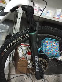 Vendo Trek supercaliber 9.8 Gen. 1 preparata per le gare, utilizzata nell'ultima gara stagione 2024 e nelle prime 9 gare del 2025 poi ferma ai box. La bici presenta dei graffi zona cambio, dovuti all'utilizzo in terreni rocciosi Marathon e XC. Cambio elettronico, forcella Dt Swiss preparata da gara (lavora in progressione) ammo centrale fox tarato a 60 kg con token medio. Disponibili i token grande e piccolo. Le ruote sono in carbonio, modello pro canale 30. Nelle foto risaltano gli elementi di valore della bici, così come i freni specificatamente per uso marathon o XC con frenata in progressione.