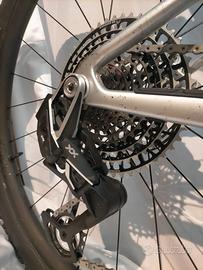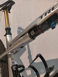 Montaggio top di gamma con trasmissione Sram XX SL AXS T-TYPE 12v, ruote Bontrager Kovee RSL 29 in carbonio super leggere, forcella SID Ultimate 110mm, freni Sram Level Ultimate 4 pistoni, manubrio integrato Bontrager RSL in carbonio, telescopico Fox Transfer SL Kashima 125mm, sella AEOLUS RLS in carbonio.