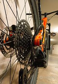 Telaio Alluminio Alpha Platinum, escursione 115 mm, forcella RockShox Judy RL da 120 mm, ammortizzatore X-Fusion Pro 2, trasmissione SRAM SX Eagle, 12 velocità, freni a disco idraulici Shimano MT200, ruote Bontrager Kovee, reggisella telescopico TranzX JD-YSP18.