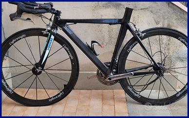 Le ruote sono in carbonio storte e presentano alcune lesioni e raggi mancanti