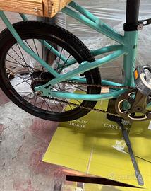 Triciclo con due portapacchi, marca Bianchi, con freni a disco e sospensioni oscillanti.
