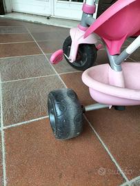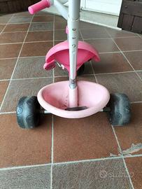 Triciclo rosa con pedali per pedalare in autonomia + asta per spinta e controllo da parte dell' adulto. Usato ma ben tenuto, adatto da un anno e mezzo circa.