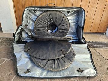Vendo Valigia Trolley per bici da Corsa , Gravel, Mtb. Il fondo è rigiro, la bici viene fissata su telaio metallo utilizzando i perni delle ruote (non perni passanti ma tradizionali) , lati sono sono soft ma protetti da dei cuacinetti d’aria (foto 3). Il manubio bici a seconda della grandezza bici viene semplicemente girato per lungo o sfilato e fissato al telaio con apposito accessorio a corredo. Molto semplice e veloce da usare , leggera e facile da trasportare . Vendo per cambio valigia SciCon da Thriatholn .