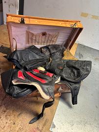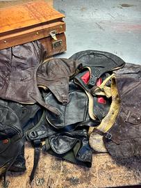 Bellissima valigia in cuoio vintage contenente 9 cappelli in pelle o da motociclisti o da avviazione tedesca vedere le foto x farsi un idea guardate le altre mie inserzioni x qualsiasi chiarimento non esitate a contattarmi.