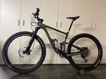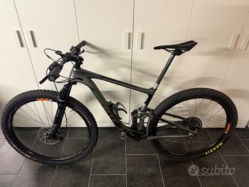 MTB full suspended in carbonio (100 mm AV/AR), forcella Fox 32 + ammortizzatore DPS, trasmissione SRAM GX Eagle 12V, ruote in carbonio tubeless, freni Shimano nuovi, pneumatici nuovi Continental & Maxxis. Taglia M. Appena revisionata – pronta all’uso!