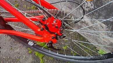 Ruote 29", manubrio 78 cm, attacco corto 45mm oversize, guarnitura monocorona 32T con cambio 9v, freno a disco Tektro a disco idraulico con olio minerale.