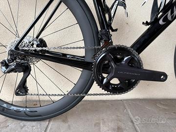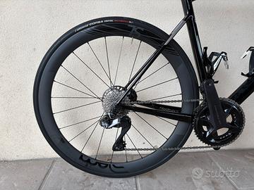Wilier slr0 (carbonio), trasmissione Shimano Ultegra Di2, con ruote in carbonio Deda sl 45 (posteriore) e Deda sl 35 (anteriore), sella fizik argo in carbonio.