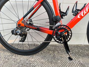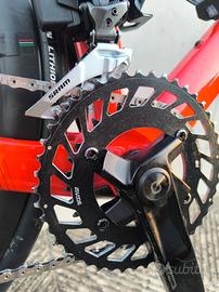 La bici monta gruppo SRAM RIVAL AXS 2X12,ruote e manubrio in carbonio e Power Meter.