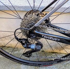 Telaio carbonio monoscocca, cambio Shimano 105 con guarnitura 50-34 e cassetta 11-34 a 12 velocita'. Freni a disco Shimano 105, ruote Miche Reflex. Taglia L. Peso (con pedali) 9.6 kg. Vedere sito Wilier per ulteriori caratteristiche. Bici, adatta ad altezza 175-180 cm. Vendo con sella originale e senza pedali. Piccola riga sulla leva dx per strisciata con muro garage.