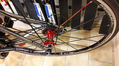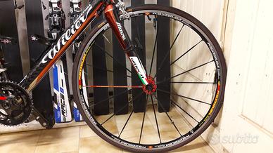 Bici da corsa taglia M ancora fatta a mano in Italia con forme e soluzioni innovative, di notevole valore collezionistico perché è la versione limitata con lo storico colore ramato, cromo e carbonio. Cambio Shimano Ultegra 10V e pacco piagnoni Dura Ace guarnitura Fulcrum in carbonio, manubrio aero in carbonio, ruote Mavic Ksyrium edizione limitata, copertoncini nuovi Hutchison Atom, catena nuova Shimano. Forcella Mizuno
