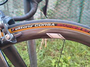 - Pneumatici Vittoria Corsa Graphene 2.0 da 25 mm con camere d’aria in TPU (cerchi compatibili tubeless). Le gomme sono da cambiare, a causa del poco utilizzo nell'ultimo mese si stanno formando delle crepe nella gomma.