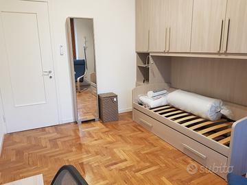 affitto camera in via Azalee 11, zona sud-ovest, zona residenziale e signorile, metropolitana Primaticcio (tratta per Cadorna: 10 minuti, 15 per Duomo), in appartamento completamente ristrutturato in elegante condominio, 1° piano, composto da quattro camere (regolazione autonoma del termosifone e del climatizzatore per ogni camera), ingresso, cucina abitabile (ampio frigorifero, forno, microonde, ampio tavolo, attrezzatura da cucina completa), due bagni con docce, ripostiglio, 2 balconi. Superficie catastale 114 mq. Porta blindata, router fibra ottica, riscaldamento centralizzato con termovalvole, climatizzatore, videocitofono, portineria, ascensore, giardino condominiale con campo da tennis. Contratto di locazione, uso abitativo, 4+4 anni, rinnovabile, in regime di cedolare secca. Affitto mensile complessivo per la camera pari a € 600. Spese condominiali (salvo conguaglio) e servizio settimanale di pulizia inclusi, escluse spese a consumo (luce, gas, internet). Recesso anticipato con preavviso di 3 mesi, cauzione di 3 mesi. (classe energetica E 142 Kwh/m2).