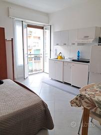 La camera è arredata come un miniappartamento autonomo, è dotata di balcone, di un letto matrimoniale, armadio a 4 ante, cassettiera, ampio angolo cottura, 4 fornelli, fornetto, frigorifero e freezer a 3 cassetti, piccolo tinello, divano e TV. E' pronta da abitare, con stoviglie, biancheria da bagno e da letto. Il bilocale ha un ingresso e un ampio bagno con doccia e lavatrice, da condividere con la persona della seconda camera già occupata.
