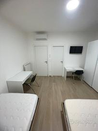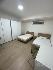 Proponiamo in affitto una spaziosa camera doppia, ideale per due inquilini e non destinata ad uso singolo. La camera è arredata con due letti, due comodini, due armadi e due scrivanie, garantendo un ambiente confortevole e funzionale.