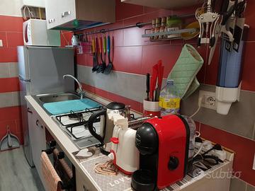 La cucina è composta da frigo, microonde, forno classico, fornelli a gas, friggitrice ad aria, macchina del caffè, tavolo, pentole, posate, piatti, finestra.