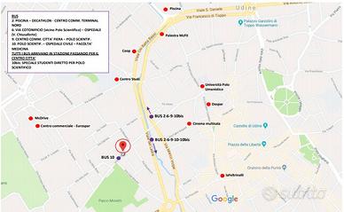 Fermata bus 10 sotto casa (per Ospedale, Polo Scientif, Centro studi Stellini-Copernico-Deganutti, Facoltà di Economia). A 4' a piedi fermate bus 9 (per P. Scientif. e Città Fiera), bus 6 (per P. Scientif.), bus 2,4,5. Tutti portano in pochi minuti alla stazione di treni e corriere. Posti auto liberi lungo la via. Non sono graditi animali. Contratto transitorio individuale di 12 mesi, senza spese di agenzia.