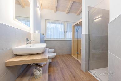 Il bagno privato, elegante e spazioso, è completo di ampia doccia in cristallo, sanitari moderni e finiture di qualità. Un plus esclusivo è la sauna privata in legno, ideale per rilassarsi e rigenerarsi direttamente a casa.