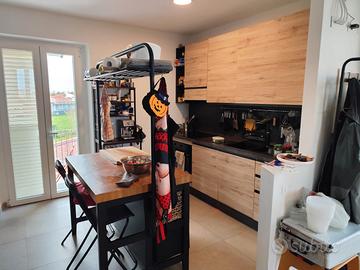 La casa è al primo piano con scala esterna ed ingresso autonomo. Entrando, a destra troviamo la cucina con isola per pranzi veloci, mentre a sinistra abbiamo la sala con tavolo da pranzo, divano letto matrimoniale per eventuali ospiti e home theater con proiettore per guardare Rupaul, partite o altri eventi, a seconda delle preferenze.
