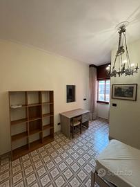 Stanza singola con letto singolo e comodino, scrivania, armadio, libreria. La stanza presenta un bagno privato (in foto).
