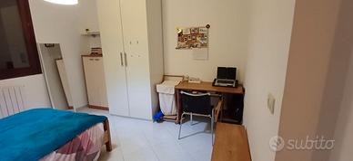 La camera è spaziosa, luminosa e arredata con letto, armadio, scrivania e complementi utili, garantendo comfort e praticità.
