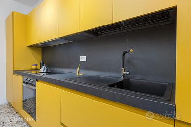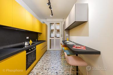 L'intero appartamento, composto da 7 stanze, è stato progettato pensando alla comodità e al design per garantire una convivenza piacevole tra 7 studenti. La cucina, completamente accessoriata, dispone di un frigorifero con 7 ripiani (1 per inquilino) che offre tutto lo spazio necessario. La zona living, adiacente alla cucina, è caratterizzata da un elegante tavolo tondo e sedie colorate.