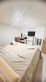 Appartamento 50 mq suddiviso su due livelli camera matrimoniale con letto maxi large 2 piazze e mezzo con cassettone contenitore per biancheria e piumoni per tutta la larghezza/con tv Smart satellitare collegato ad internet è dotato di due comodini a doppio cassetto e scrivania organizzata con cassetti e lampada predisposto su vano soppalco accessibile con scala larga in ferro ,più camera sottostante tutta completamente arredata di armadio grossa dimensione con porte scorrevoli salva spazio e un divano elegante con seduta per quattro persone che diventa letto largo ospitante due ragazzi oppure un adulto a lato si trova stanza bagno con cabina doccia e bidet fornito di termo arredo autonomo e ventola aspirazione più finestrino - il tutto servito da fornitura di aria condizionata caldo freddo e termosifoni per riscaldamento autonomo . Cucina separata ad angolo con forno ,frigorifero grande misura con congelatore e fornita di tutti gli