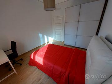 Camera rossa: letto contenitore da una piazza e mezza, capiente armadio, specchiera, comodino, scrivania e comoda sedia. Canone: 540 euro + 50 euro di condominio, WI-FI e Tari. Utenze escluse.