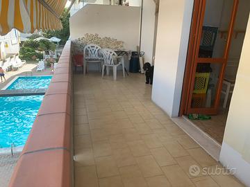 Affitto casa con posto auto a 300 mt dal mare composta da 1 sala con angolo cottura e divano letto per 2 persone, 1 camera da letto matrimoniale, 1 bagno con boiler per acqua calda ed un ampio balcone che si affaccia sulla piscina del residence eventualmente usufruibile con un supplemento da pattuire alla reception. Tutte le stanze sono climatizzate. A 100 metri ampio parco giochi per bambini e situata a 100 metri dalla caserma dei carabinieri.