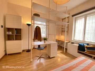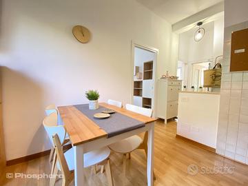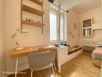 Appartamento, con una ampia stanza singola e una doppia ad uso singola, ha una cucina abitabile arredata e corredata con lavastoviglie e microonde e un bagno finestrato condiviso. Agli inquilini è garantito l'uso della cantina.