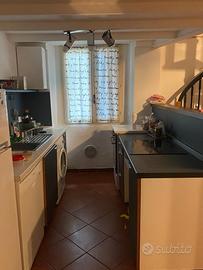 completamente arredato, con un soppalco finestrato dove c'è la zona notte con 2 letti singoli e un bagno con vasca: al piano terra c'è un altro bagno, la zona cottura con lavatrice e lavastoviglie e la zona giorno con tavolo e divano.