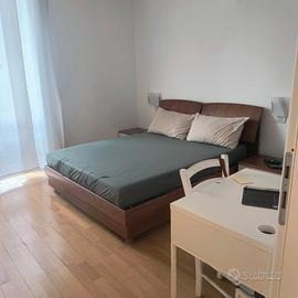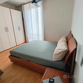 Letto matrimoniale con contenitore, armadio 8 ante, comodini, scrivania, piccolo balcone con affaccio sul viale.