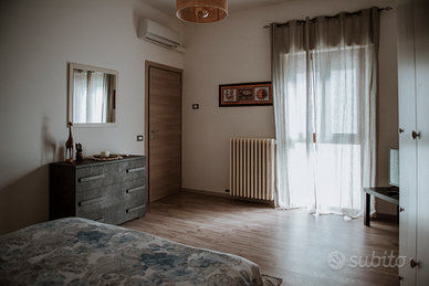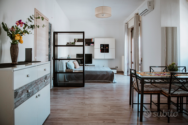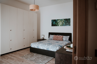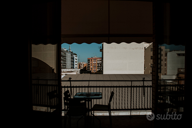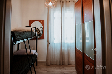 1) Moderna camera ampia e luminosa con balcone , completamente ammobiliata, con letto matrimoniale -contenitore, tavolo da sei posti,scrivania e divanoletto, climatizzatore.