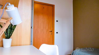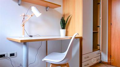 Questa accogliente e luminosa camera, parte di un appartamento con 3 inquilini, massimizza lo spazio per offrire sia comfort che funzionalità. Dotata di scrivania spaziosa, sedia imbottita, e armadio a due ante con cassettiera, include anche una mensola per i libri.