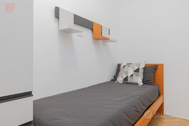 Stanza è dotata di un letto a una piazza e mezza 120 x 200 cm con rete a doghe, materasso ortopedico e coprimaterasso, comodino, armadio alto, Scrivania 135x60 cm, sedia design, lampada e contenitore pensile.