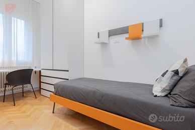 Stanza è dotata di un letto a una piazza e mezza 120 x 200 cm con rete a doghe, materasso ortopedico e coprimaterasso, comodino, armadio alto, Scrivania 135x60 cm, sedia design, lampada e contenitore pensile.