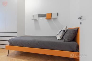 Stanza è dotata di un letto a una piazza e mezza 120 x 200 cm con rete a doghe, materasso ortopedico e coprimaterasso, comodino, armadio alto, Scrivania 135x60 cm, sedia design, lampada e contenitore pensile.