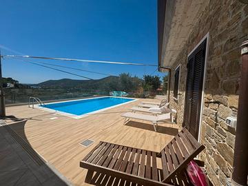 Camera da letto con letto matrimoniale, macchina del caffè e mini frigo in camera, bagno con box doccia, a bordo piscina con spazio esterno vivibile e arredato.