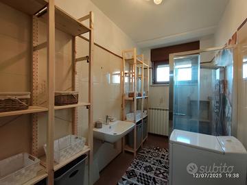 Il bagno grande ha doccia idromassaggio, lavatrice e 4 scaffali con ripiani e cesti per la biancheria sporca di ciascun inquilino. Quello piccolo ha una doccia di servizio e un mobiletto contenitore.
