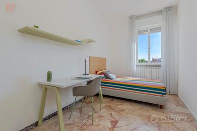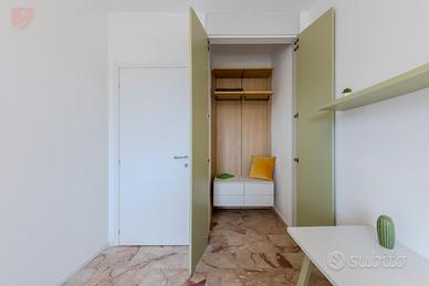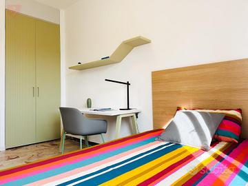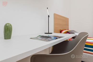 Dispone di un letto a una piazza e mezza con materasso ortopedico e coprimaterasso per un riposo ottimale. Accanto, un tavolino tondo offre spazio per oggetti personali. La cabina armadio, dotata di ripiani e aste portabiti, insieme a una cassettiera, offre una soluzione organizzativa completa. Una scrivania di 135 x 60 cm e una mensola aumentano la funzionalità dello spazio di lavoro, completata da una comoda sedia BABILA Pedrali.