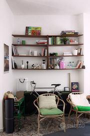 tavolino, libreria, scrivania e accesso al balcone.
