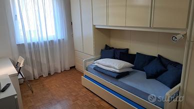 # La stanza è di circa 11 m², arredata con scrivania e sedia, libreria, cassettiera, armadio a ponte su letto singolo, con 2° letto estraibile.